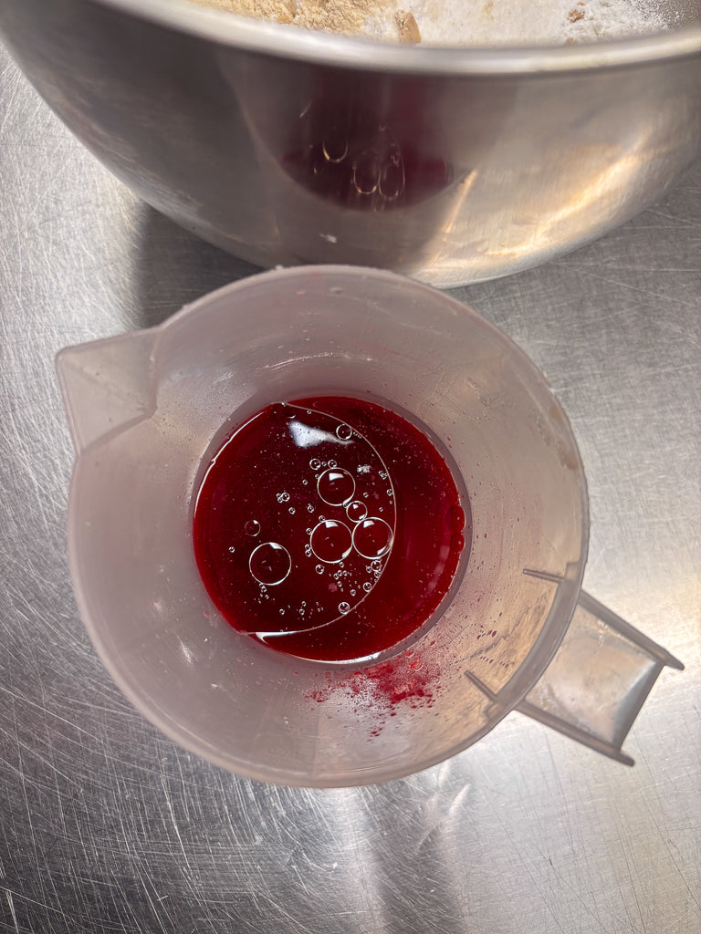 Frulla acqua, olio, polvere di barbabietola ed eventuali altri ingredienti aromatizzanti per ottenere un’emulsione senza grumi.