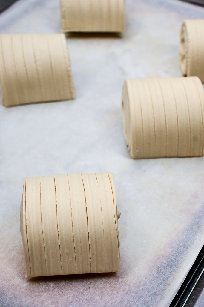 Una volta completate le pieghe, ritagliare delle strisce sottili da 5mm di larghezza, parallele ai lati aperti. Inumidire leggermente la superficie dell’impasto con acqua, in modo che le strisce aderiscano bene, quindi distribuirle uniformemente sulla superficie con la sezione laminata rivolta verso l'alto. Questo passaggio aiuta a creare una texture decorativa e un effetto più croccante sulla superficie.
