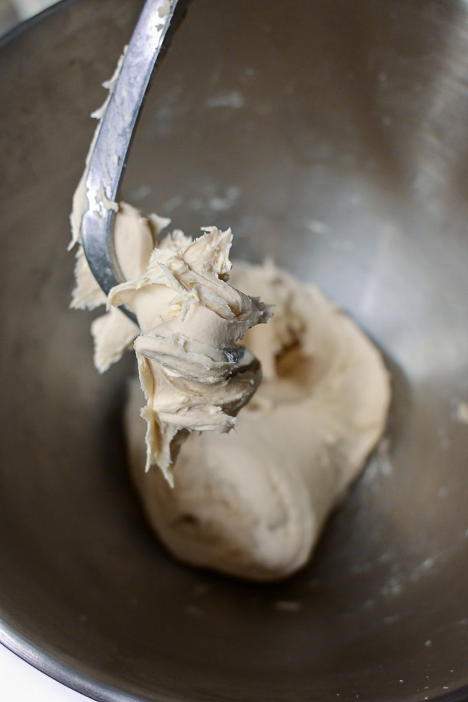 Versare a filo i liquidi e aumentare a velocità media alta, continuando a lavorare per 5/6 minuti. Di tanto in tanto e a macchina ferma, pulire i lati della ciotola usando una spatola e riportando l'impasto al centro.