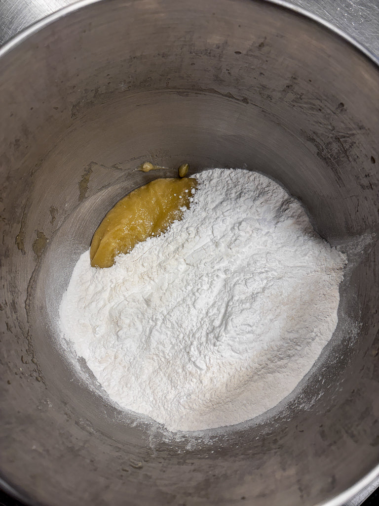 Riunisci tutti gli ingredienti nella ciotola dell’impastatrice e inizia a impastare utilizzando il gancio (o la foglia) a velocità media. Di tanto in tanto, a macchina ferma, pulisci i lati della ciotola con una spatola, riportando l’impasto al centro.