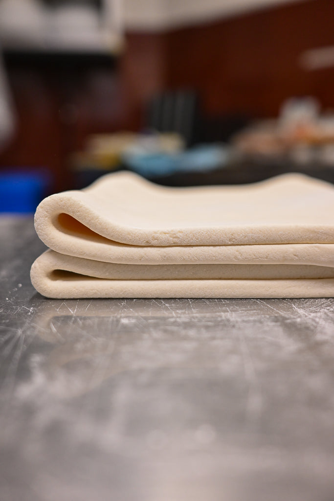 Stendere l'impasto allo spessore di 8mm (pizzette, sfogliatine, ventagli di sfoglia, ecc.) oppure 6mm (cannoncini di sfoglia, grissini sfogliati), in base alla tipologia di prodotto che si vuole preparare.