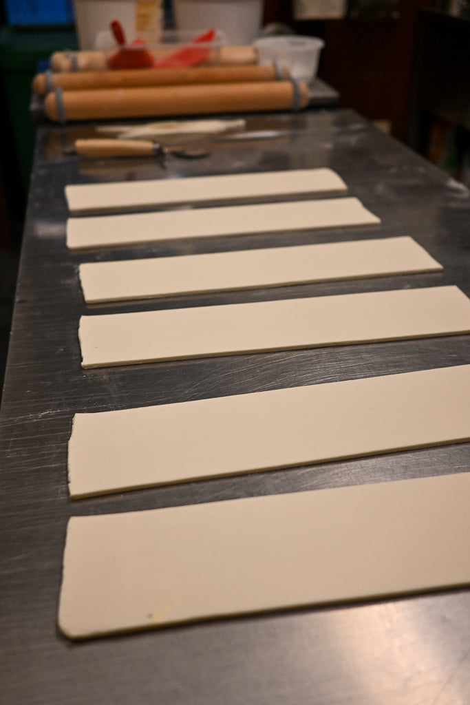 Knead the dough twice (four times) until it's 8mm thick, without pausing or resting between each turn. Use rice starch only if necessary, and don't overdo it, as it will dry out the dough too much.