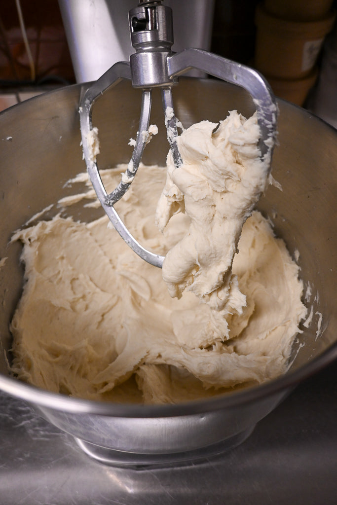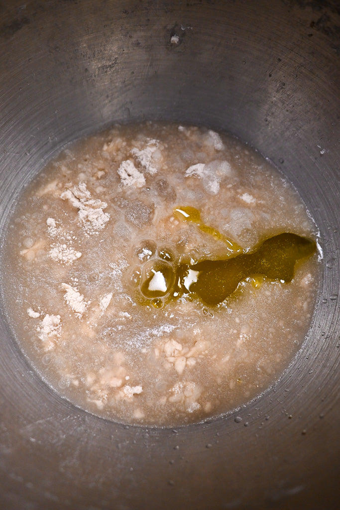 Transfer all the ingredients to the bowl of a stand mixer and start mixing using the dough hook (or paddle) at medium speed. Occasionally stop the machine and scrape down the sides of the bowl with a spatula, bringing the dough back to the center. It is important to work the dough for an extended time, until it becomes smooth, uniform, and naturally free of lumps.