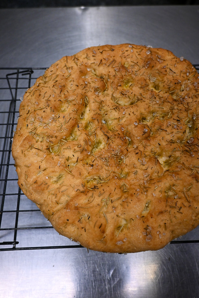 Once baked, remove the focaccia from the oven and let it cool on a wire rack to prevent moisture from forming on the bottom, which would compromise flavor and texture.