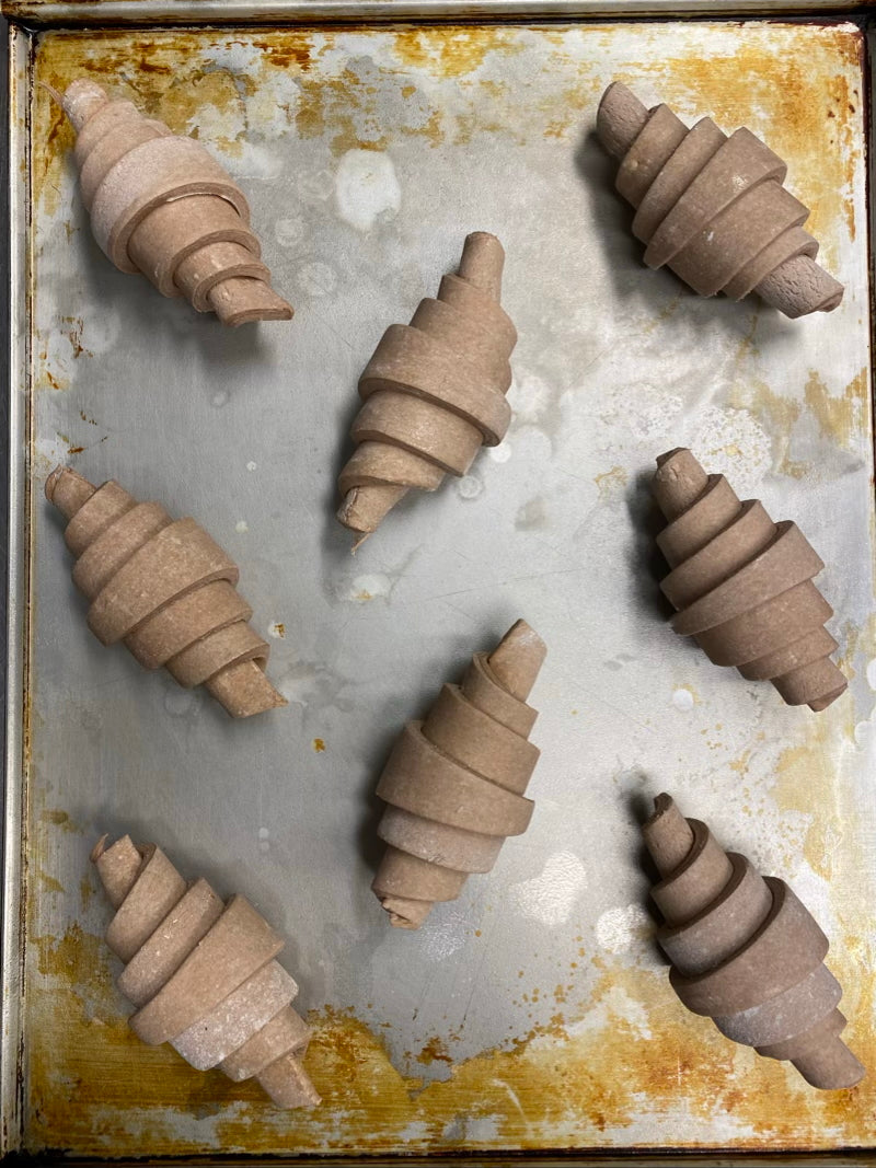 Spruzza leggermente con acqua e arrotola delicatamente per dare la forma classica del cornetto, evitando di stringere troppo.
