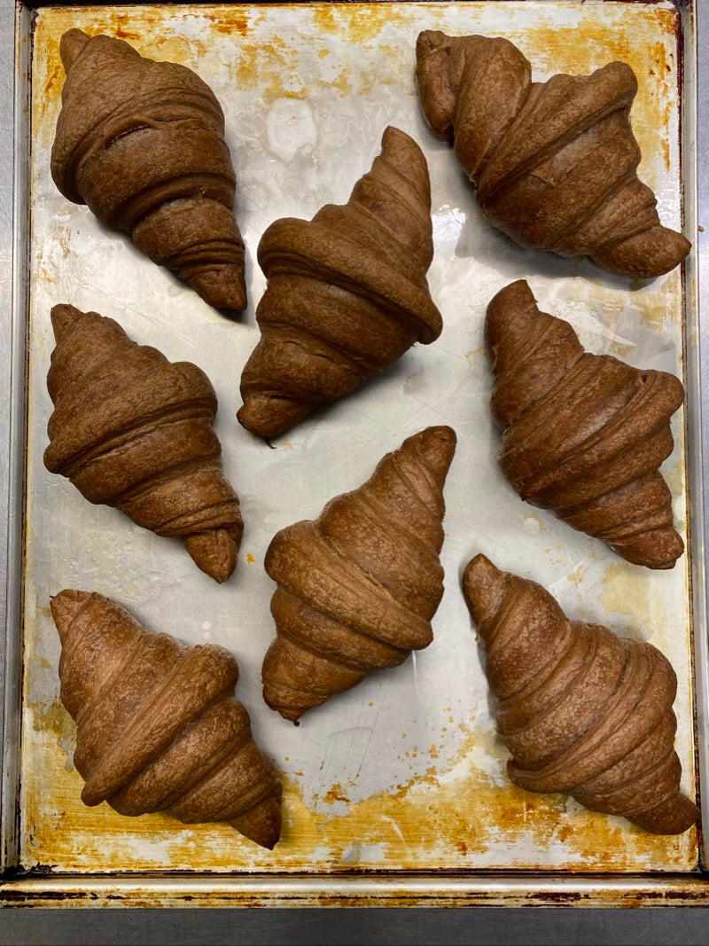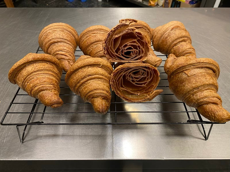Una volta cotti, trasferisci i cornetti su una gratella per farli raffreddare completamente. Dopo il raffreddamento, congelali se necessario. Puoi conservarli a temperatura ambiente per circa 48 ore o congelarli fino a 30 giorni a -18°C.