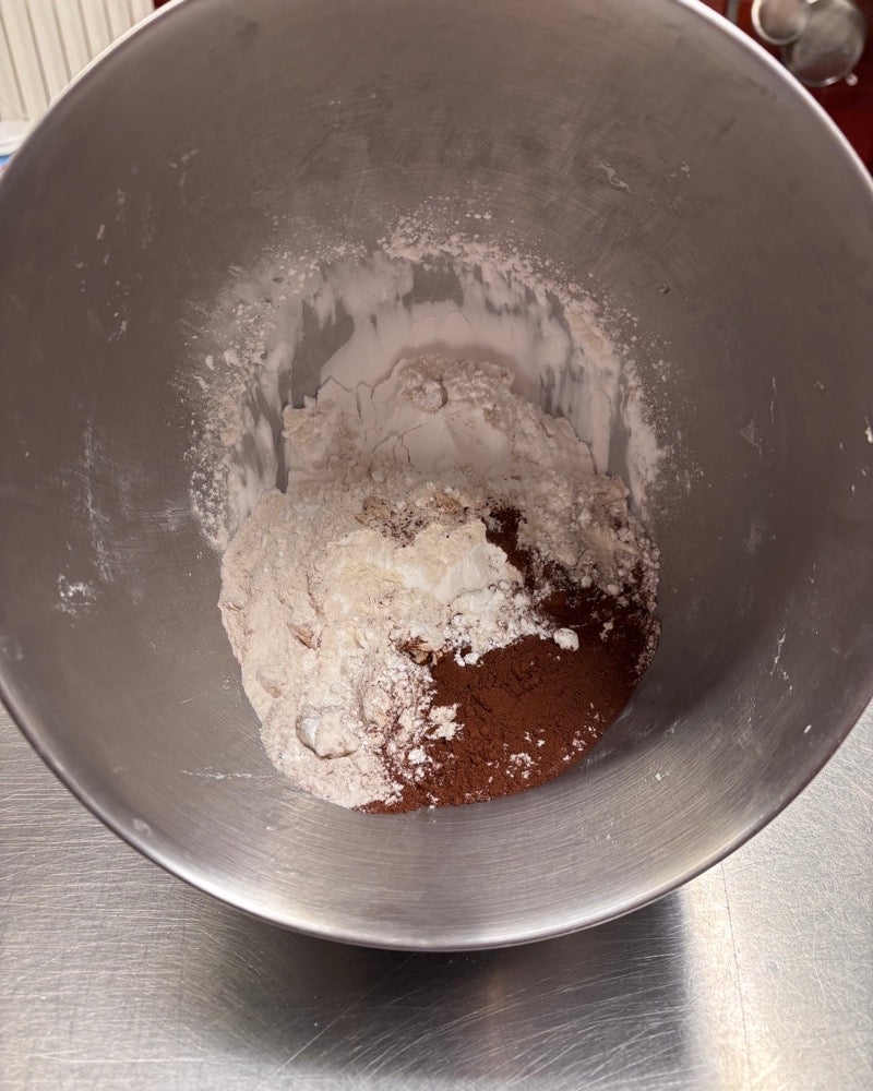 Riunire tutte le polveri nella ciotola dell'impastatrice e avviarla a bassa velocità usando preferibilmente l'accessorio "a foglia".