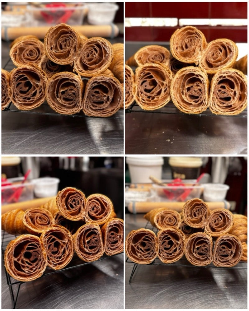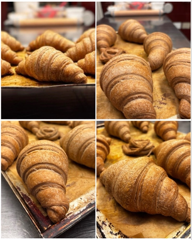 Lascia raffreddare completamente il cornetto prima di tagliarlo: in questo modo l’umidità residua si ridistribuirà all’interno del prodotto, permettendo all’alveolatura di risultare ben definita e visibile.