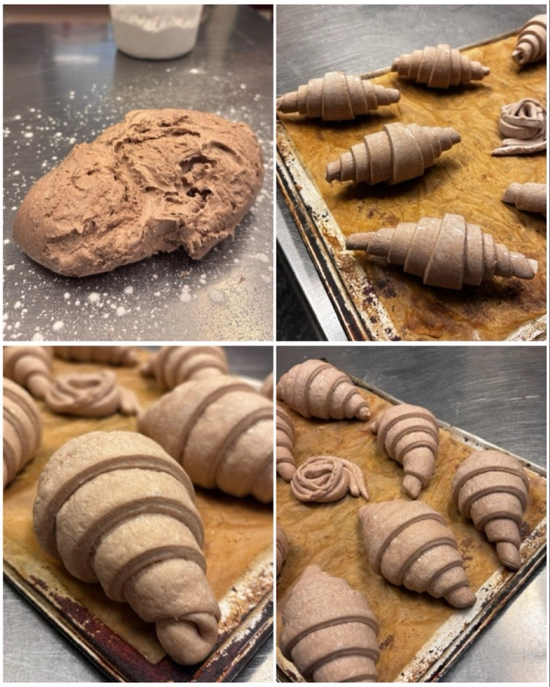 Non buttare eventuali ritagli di impasto, bensì suddividerli al centro di ogni pezzo prima di arrotolarlo. Spruzzare leggermente la superficie del triangolo con acqua e arrotolare per formare il prodotto desiderato, disponendolo su una teglia foderata di carta da forno.