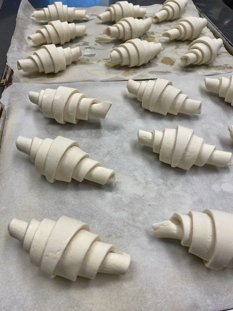 Stendere un rettangolo con il lato lungo di almeno 32cm e ricavare 4 rettangoli con lato corto da 8cm e da ognuno ricavare due croissant, tagliando il rettangolo longitudinalmente da un angolo all'altro. Si otterranno così un totale di 8 croissant.