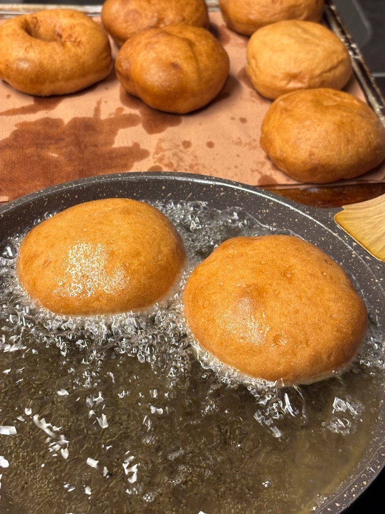 Friggere come indicato, rotolare nello zucchero semolato e farcire con crema pasticcera, confettura, Nutella, etc.