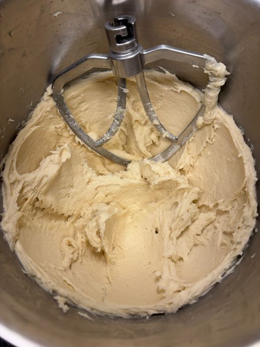 Riunire le polveri nella ciotola dell'impastatrice e con la frusta "a foglia" (detta anche frusta piatta) e a velocità media, aggiungere i liquidi.