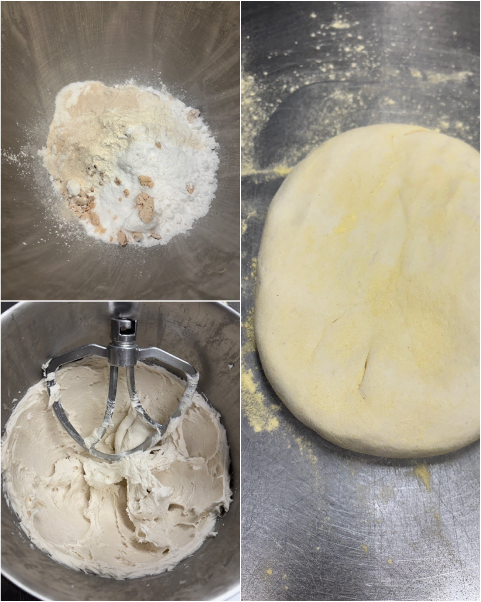 Riunire tutte le polveri nella ciotola dell'impastatrice e avviarla a bassa velocità usando l'accessorio "a foglia" (frusta piatta).