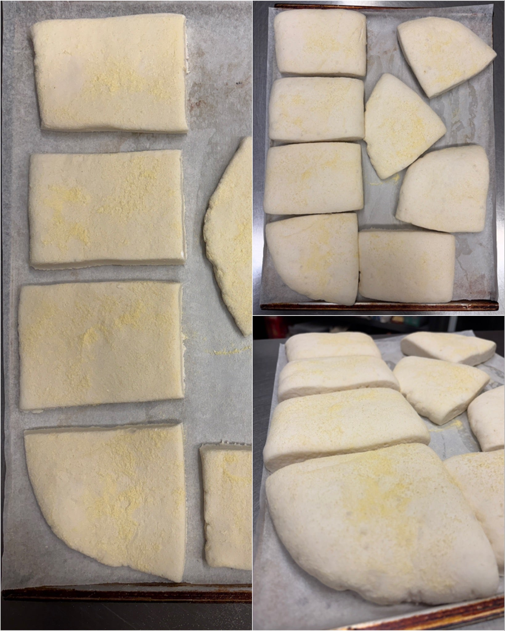 Per gli impasti laminati, come pasta sfoglia, croissant, ecc. è IMPERATIVO l'uso di amido di riso, oppure di amido di tapioca o fecola di patate, in questo ordine preferenziale. Da evitare ASSOLUTAMENTE l'impiego di farina di qualsiasi tipo e granulometria, che altera la composizione dell'impasto rendendolo secco e creando micro fratture sulla sua superficie.