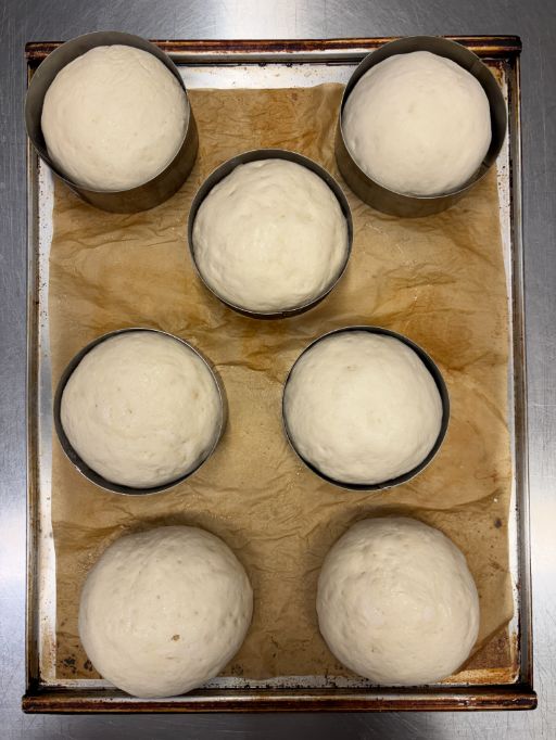 Appoggiare i panini su una teglia foderata di carta da forno e coprire con pellicola o plastica leggermente unta con olio o spray distaccante, per facilitare il distacco al termine della lievitazione.