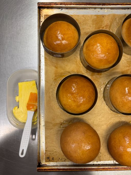 Togliere dal forno e spennellare i panini con burro morbido, che a contatto con il calore si scioglierà immediatamente, e lasciar raffreddare