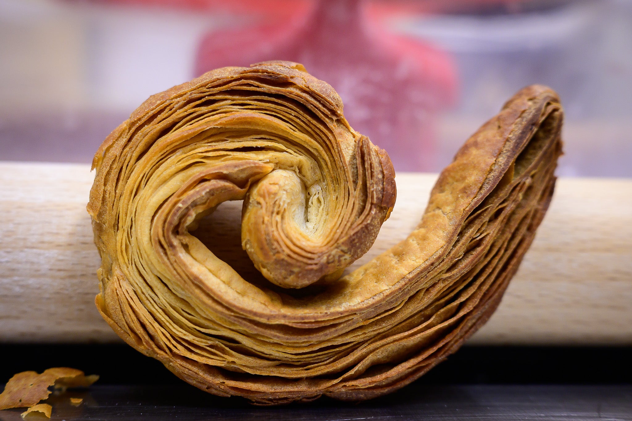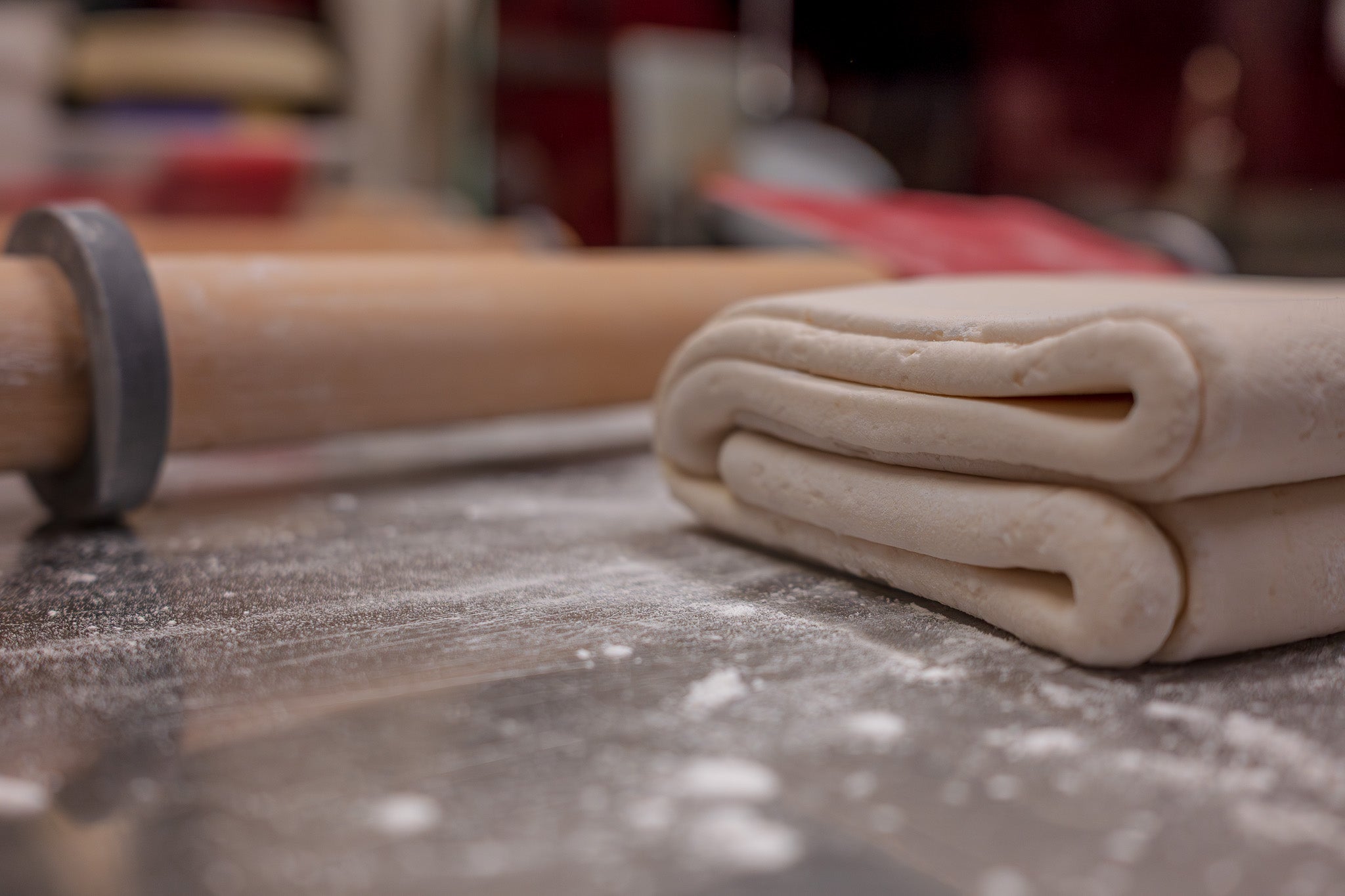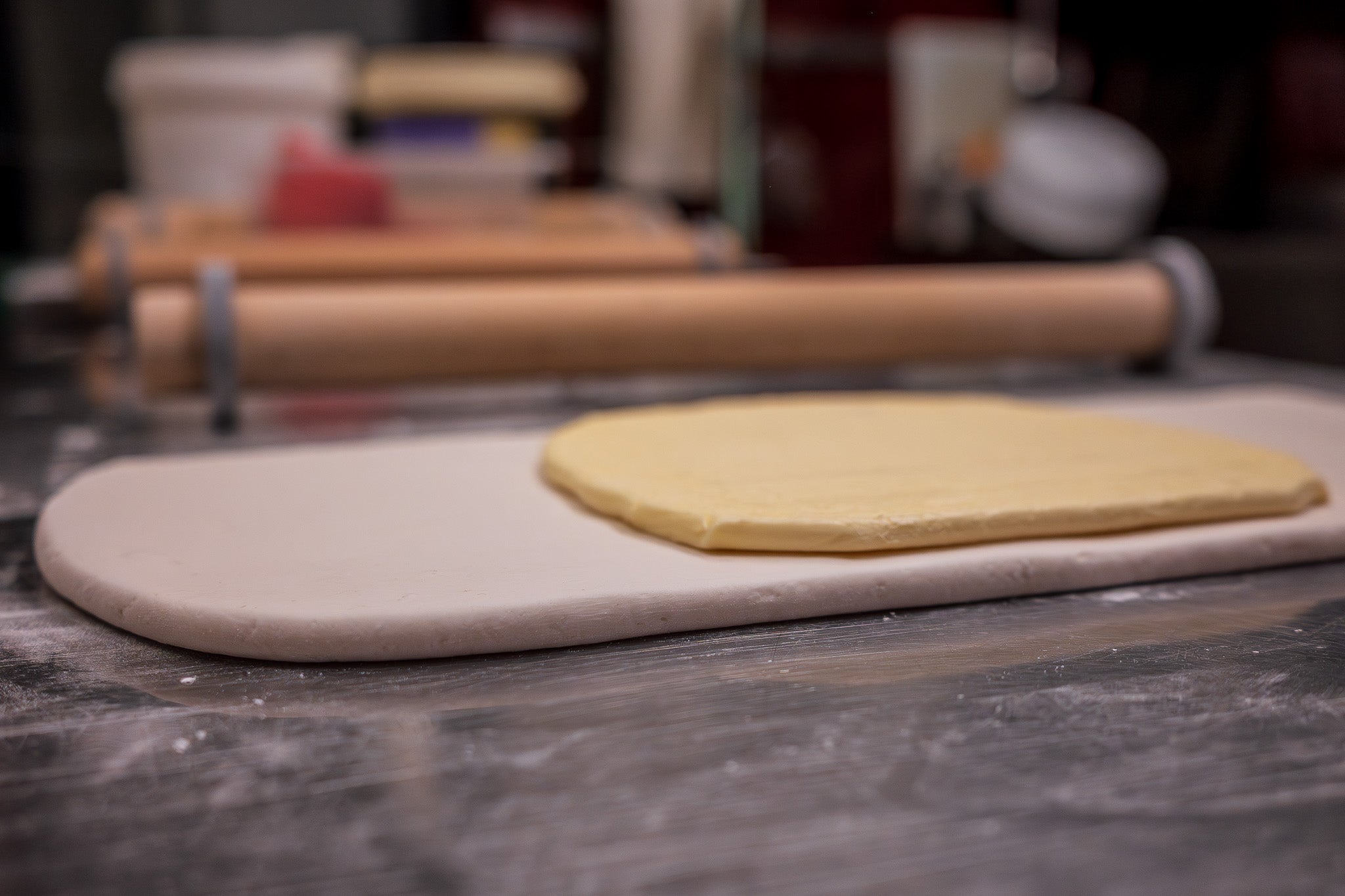 Stendere l'impasto allo spessore di 8mm (pizzette, sfogliatine, ventagli di sfoglia, ecc.) oppure 6mm (cannoncini di sfoglia, grissini sfogliati), in base alla tipologia di prodotto che si vuole preparare.