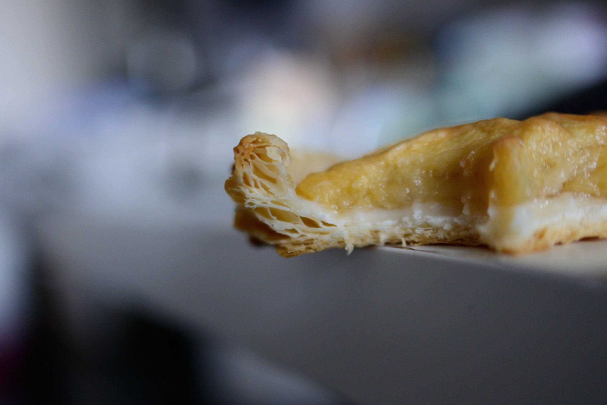 Nel frattempo formare un rettangolo con la melange, portandola ad uno spessore di circa 1cm. Non è necessario che sia un rettangolo estremamente preciso, è sufficiente che lo spessore sia uniforme. Se la temperatura ambiente è particolarmente elevata, può essere d'aiuto lasciarla 3/4 minuti in congelatore prima della fase di sfogliatura.