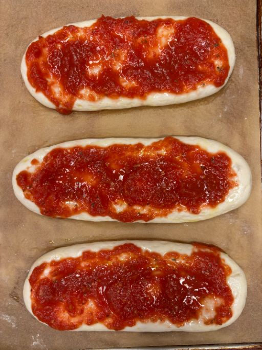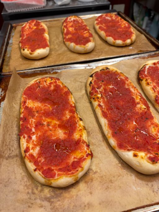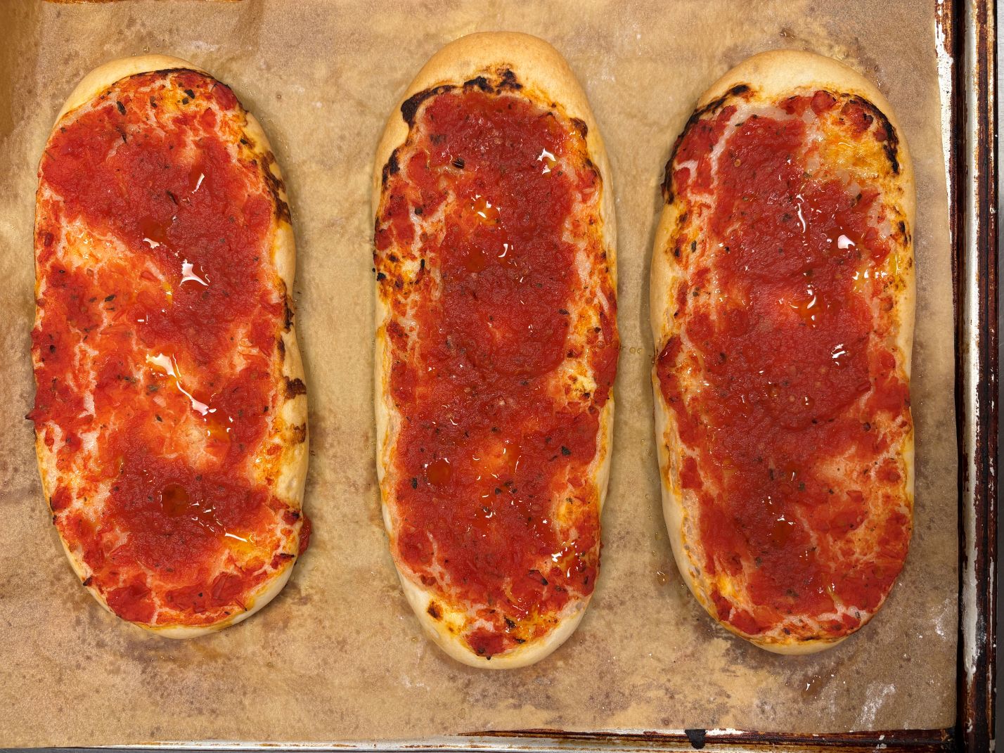 Al termine della lievitazione, ungere le pinse con un sottile strato di olio EVO, condire con la polpa di pomodoro condito e infornare subito.