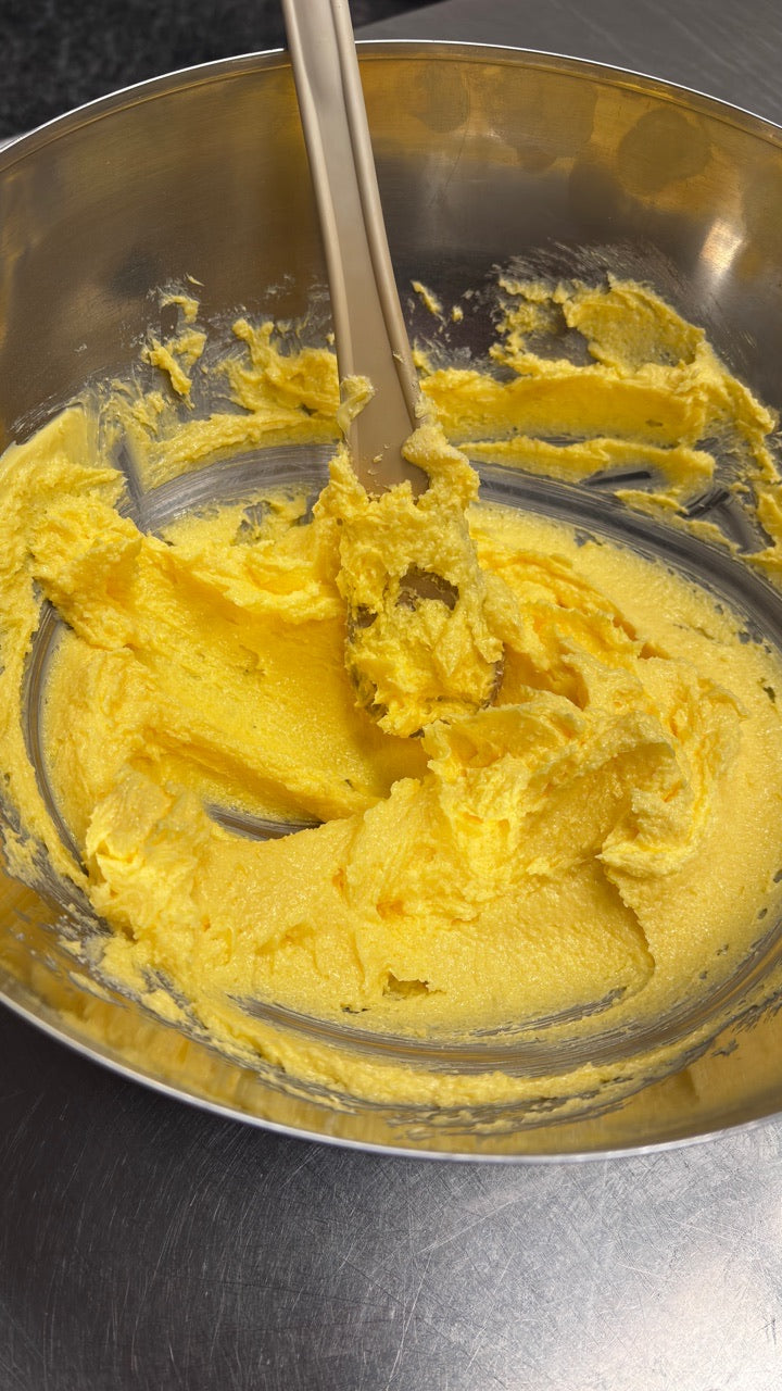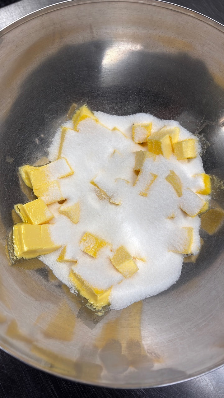 Lavorare brevemente il burro con lo zucchero, fino ad incorporarlo, ma senza montarlo o scioglierlo.